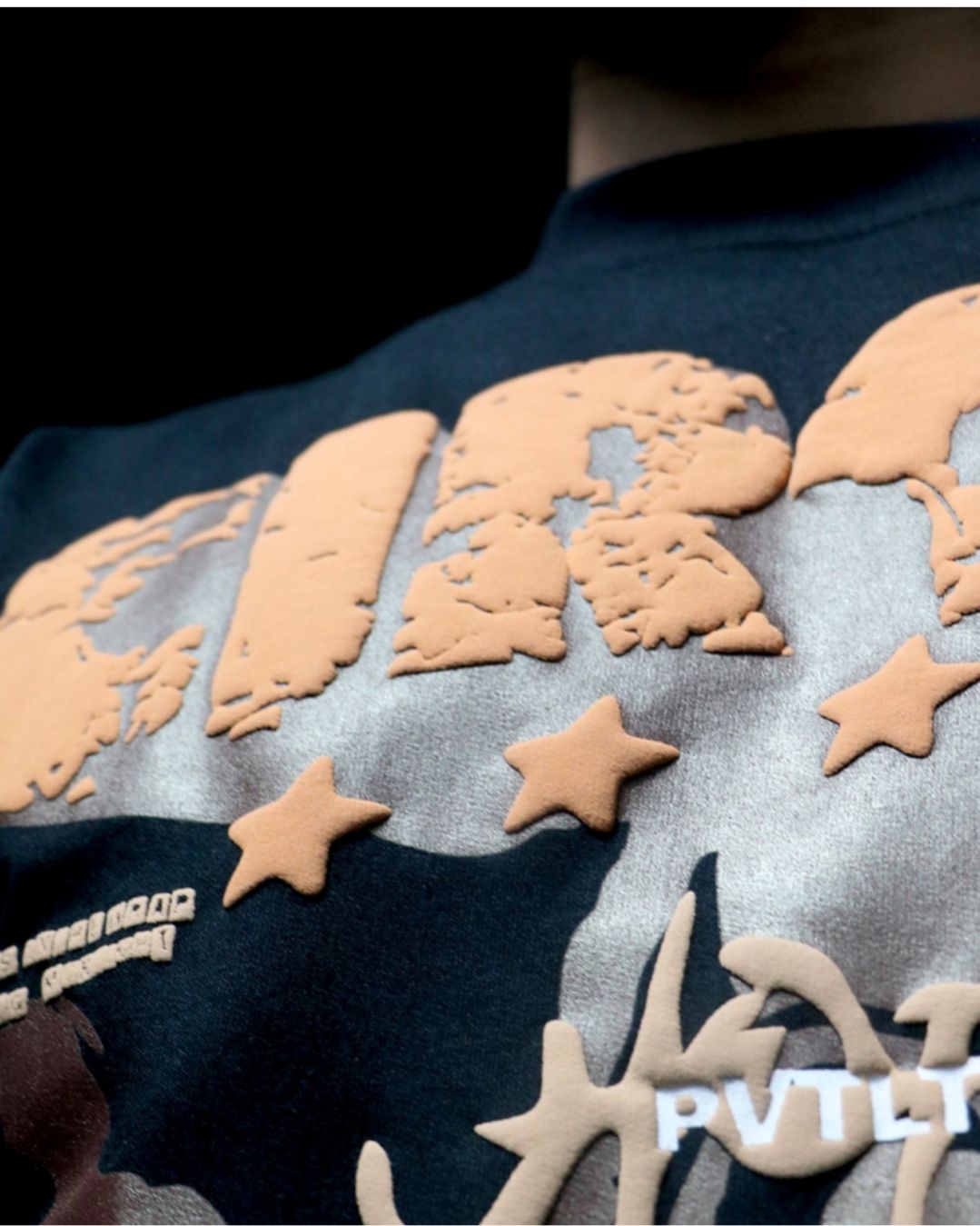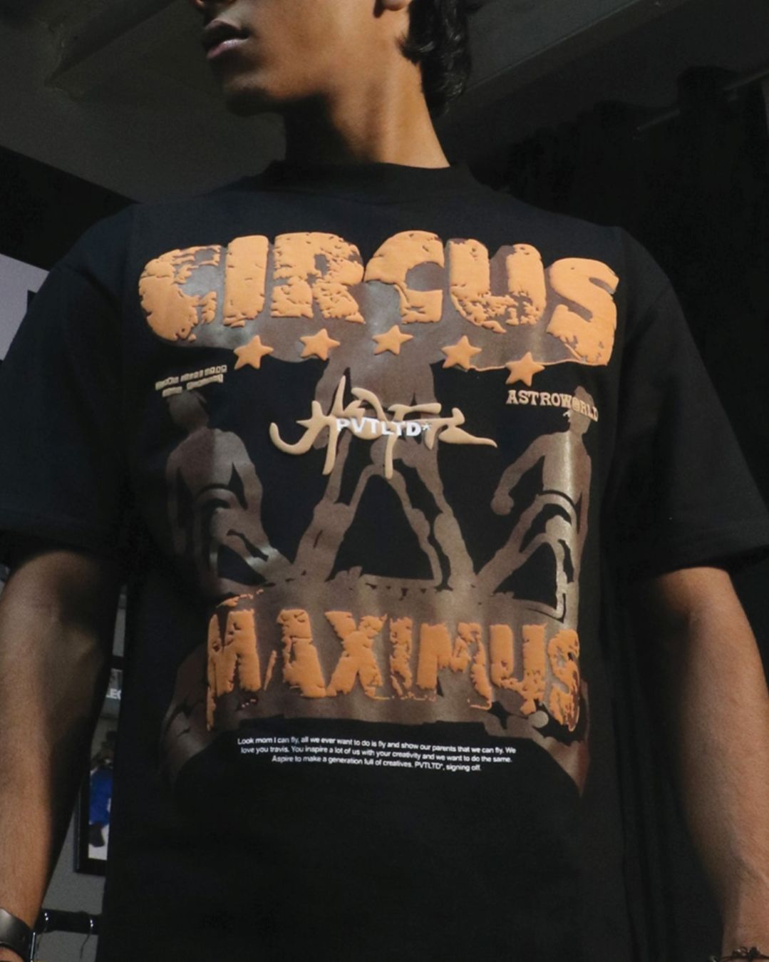 Crafted from heavyweight cotton, the Circus Maximus tee features a cracked puff print inspired by vintage concert posters and the Astroworld era. With bold textures and an oversized fit, it’s built to stand out. The back carries the classic PVTLTD* mark. Dropped ahead of Travis Scott’s India tour—this one’s for the ragers.