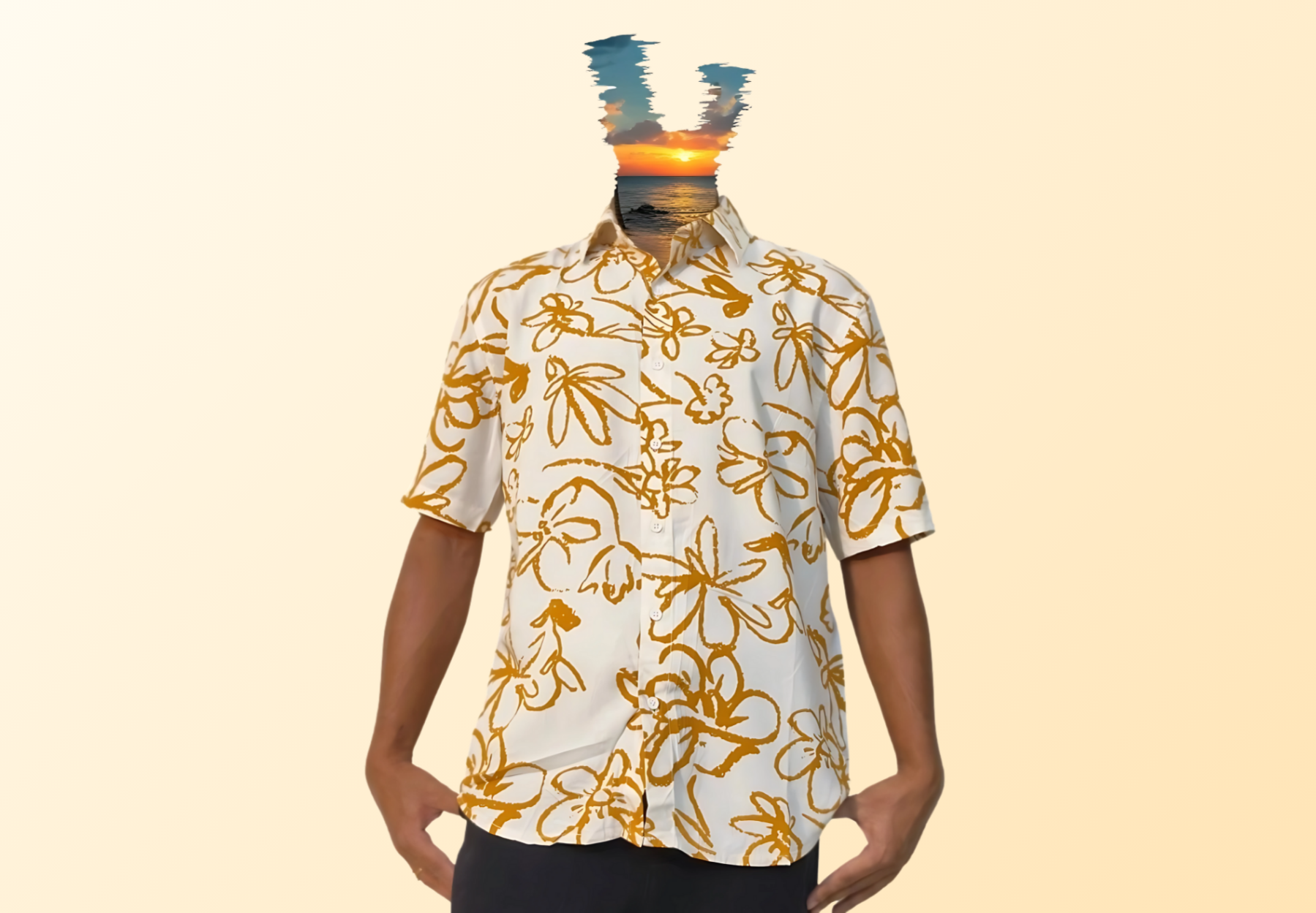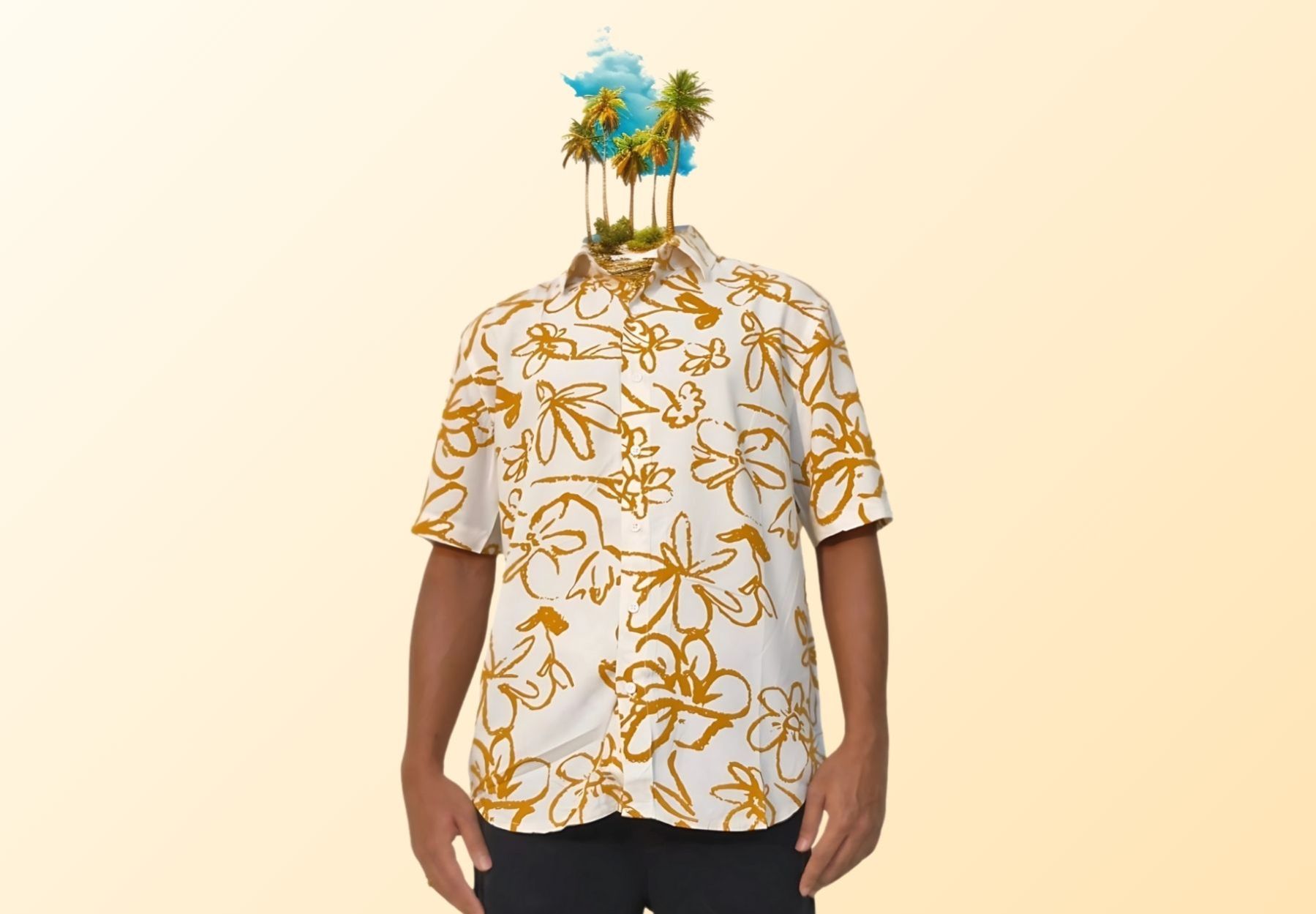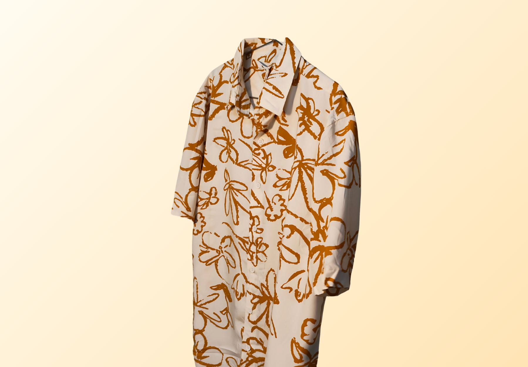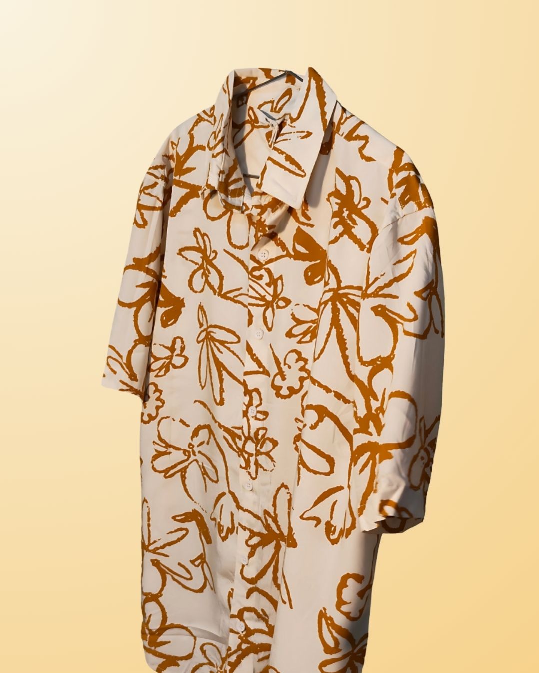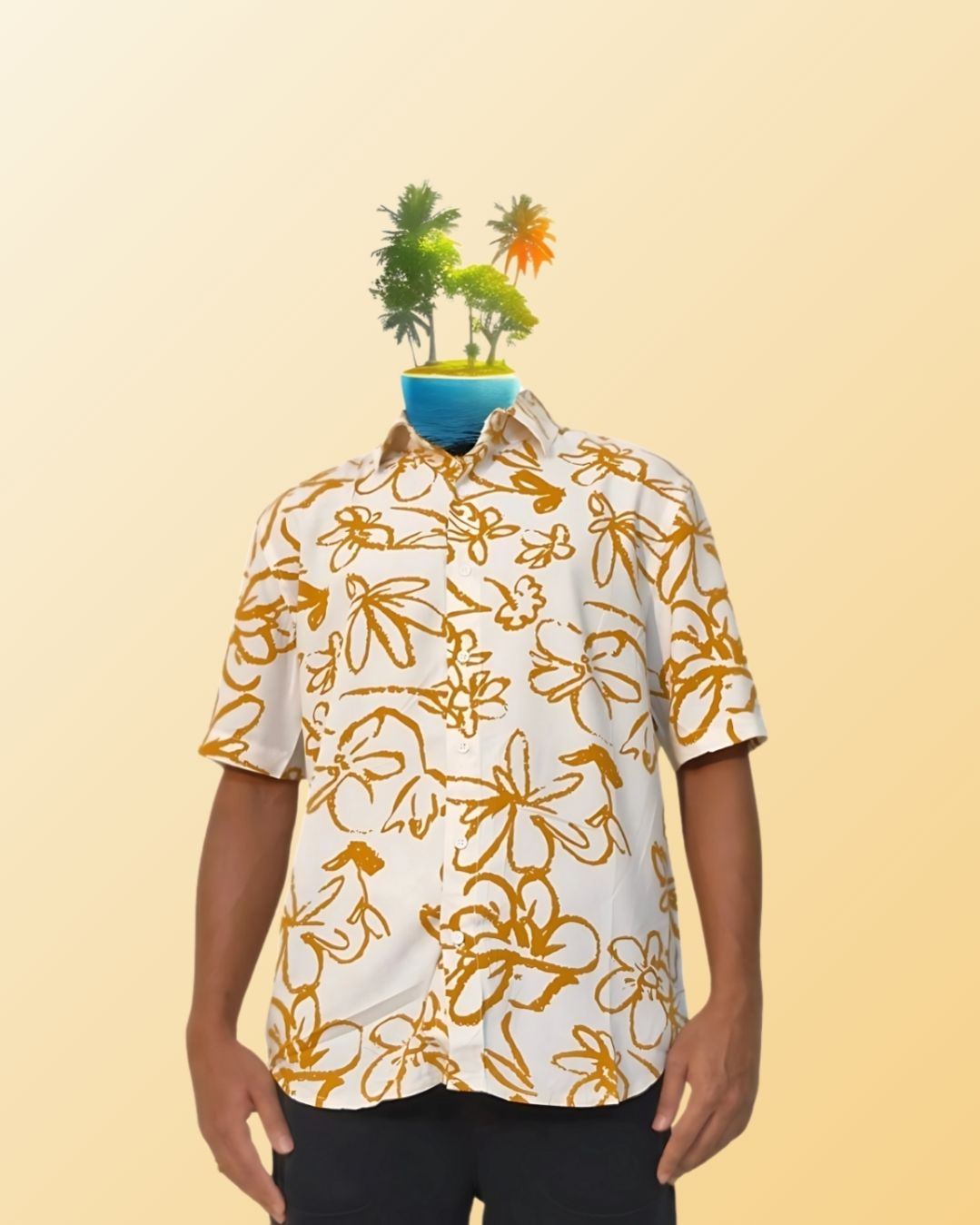 Tamarind Bloom by Bodak — a shirt that reads like a poem scribbled in golden ink. With earthy ochre blossoms scattered across a soft ivory canvas, it carries the charm of quiet tropical afternoons and old sketchbooks.