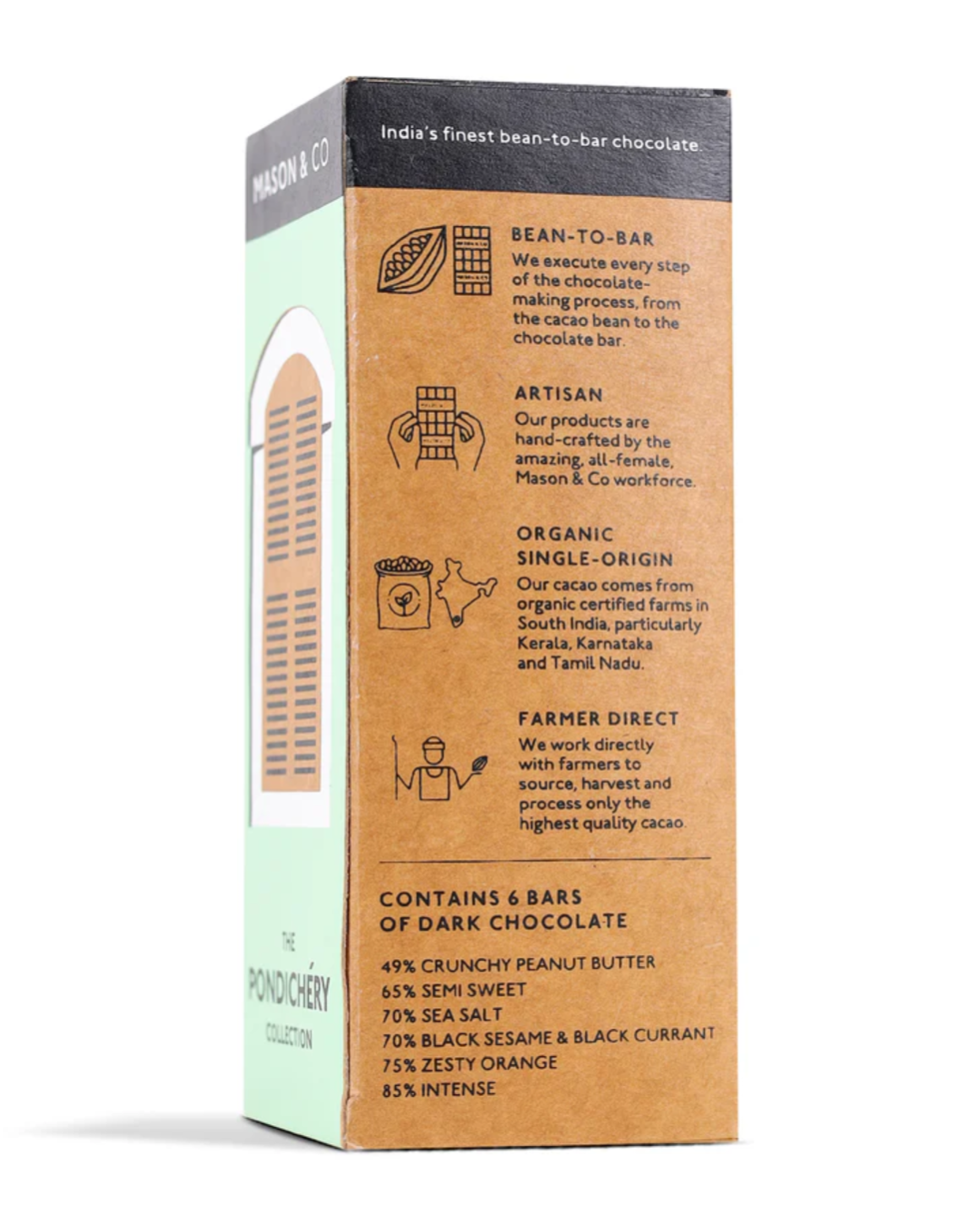 The Pondy sleeve holds six of our best-selling dark chocolate flavours in 60g: 49% Crunchy Peanut Butter Dark Chocolate, 65% Semi Sweet Dark Chocolate, 70% Sea Salt Dark Chocolate, 70% Black Sesame & Raisin Dark Chocolate, 75% Zesty Orange Dark Chocolate & 85% Intense Dark Chocolate.