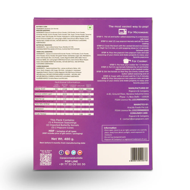 Bring gourmet popcorn to life in the comfort of your home. Our Movie Night package is the ideal snack for any occasion, whether it's a date or a chill night with friends. We have something special for everyone with 4 unique flavours, ranging from the traditional butter salted to Bhelpuri & Hari mirchi and cheese.