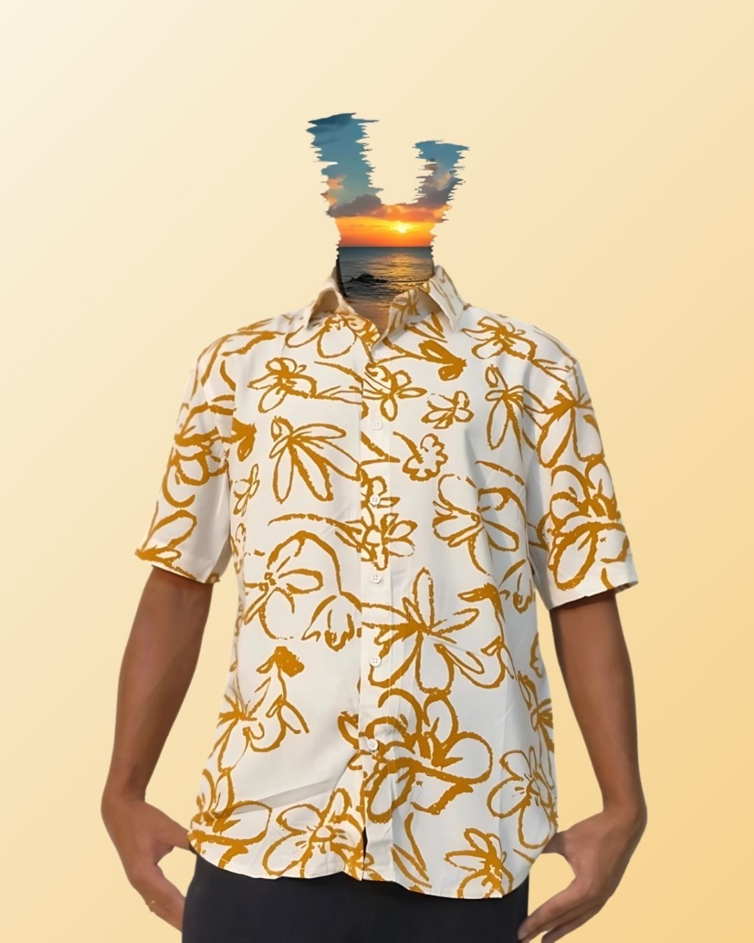 Tamarind Bloom by Bodak — a shirt that reads like a poem scribbled in golden ink. With earthy ochre blossoms scattered across a soft ivory canvas, it carries the charm of quiet tropical afternoons and old sketchbooks.